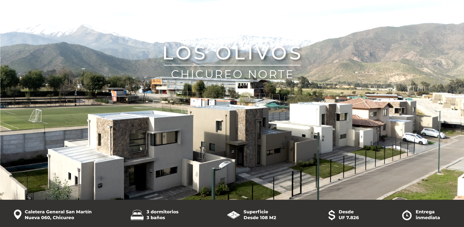 Los Olivos es un exclusivo condominio de casas mediterráneas ubicado en el consolidado sector de Chicureo Norte, con acceso directo a autopista y excelente conectividad a colegios, supermercados y servicios.